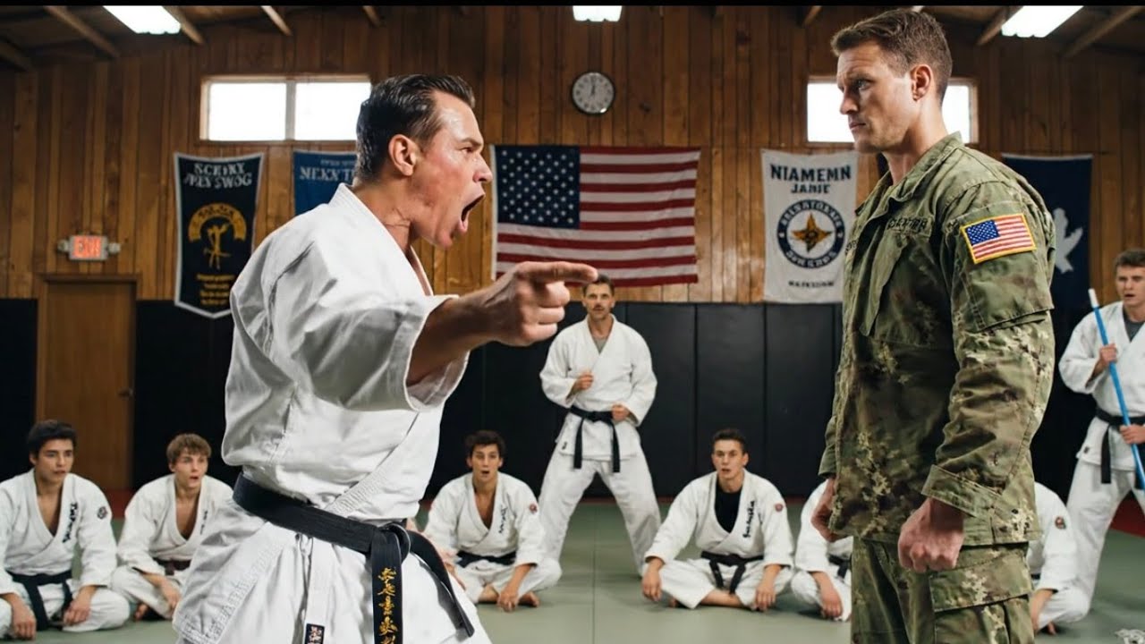 ” Dieser eine Satz reichte aus. Der Schwarzgurt drehte sich um, die Augen brennend vor verletztem Stolz, und forderte ihn offen heraus, sagte vor allen: “Wenn der Soldat den Helden spielen wolle, könne er es genau hier beweisen” und versprach, ihm eine Lektion darüber zu erteilen, seinen Platz zu kennen. Die Schüler rückten nervös hin und her, manche aufgeregt, manche unruhig, während der Hausmeister flüsterte, dass es schon in Ordnung sei, dass er keinen Ärger wolle, doch der Mann in Uniform schüttelte sanft den Kopf, seine Augen